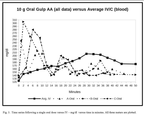 Im Jahr 2020 wurde jedoch in einer klinischen Studie am Menschen eine wichtige Entdeckung gemacht: [2, 11] Der Vitamin-C-Spiegel im Blut wurde nach der Einnahme Minute für Minute gemessen (dies kann mit einem einfachen Gerät zur Messung des Blutzuckers zu Hause durchgeführt werden). Die Probanden erhielten auf nüchternen Magen über einen unterschiedlich langen Zeitraum verschiedene Dosen von Vitamin C und Vitamin-C-Formen und maßen dann jede Minute die Veränderung ihres Blutzuckerspiegels, die den Vitamin-C-Spiegel im Blut anzeigt. (In früheren Studien wurde der Vitamin-C-Spiegel im Blut nur etwa halbstündlich gemessen.) In dieser Studie wurden 3 besonders interessante Beobachtungen gemacht: