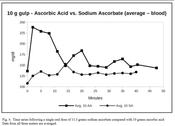 Interessant war auch, dass 10 g, wie die Ascorbinsäure oral eingenommenes Na-Ascorbat den Blutspiegel nicht annähernd so stark ansteigen ließ und die Aufnahme nur einen Bruchteil davon betrug! Einer der Gründe dafür ist, dass Na-Ascorbat den pH-Wert des Magens erhöht haben könnte. [2,11]